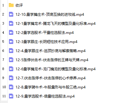 12-1量学擒龙术-腾龙飞天的模型及量化标准.mp4 594.41M 12-2量学选股术-平量柱选股法.mp4 474.97M 12-3量学跟庄-长阴短柱技术应用.mp4 484.12M 12-4.量学跟庄术-逃顶抄底与解套策略.mp4 565.64M 12-5涨停伏击术-伏击涨停的王牌与天牌.mp4 476.48M 12-6量学擒龙术-龙门擒龙的模型及量化标准.mp4 435.09M 12-7.伏击涨停术-伏击涨停的心术修养.mp4 460.48M 12-8.量学骑牛术-牛股量形与牛股三绝.mp4 483.83M 12-9.量学选股术-倍量柱选股法.mp4 542.22M 12-10.量学擒庄术-顶底互换的进攻线.mp4 465.11M