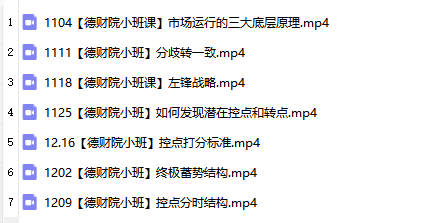 小班 1104【德财院小班课】市场运行的三大底层原理.mp4 1111【德财院小班】分歧转一致.mp4 1118【德财院小班课】左锋战略.mp4 1125【德财院小班】如何发现潜在控点和转点.mp4 12.16【德财院小班】控点打分标准.mp4 1202【德财院小班】终极蓄势结构.mp4 1209【德财院小班】控点分时结构.mp4 小班课 0219作手体系-《擒庄秘籍》辅导课——爱财社授课导师·翰林.mp4 0304《擒庄秘籍》小班课.mp4.mp4 1月22日作手体系-《擒庄秘籍》辅导课——爱财社授课导师·翰林.mp4 416-.mp4 作手体系-《擒庄秘籍》辅导课——爱财社授课导师·翰林(1).mp4 作手体系-《擒庄秘籍》辅导课——爱财社授课导师·翰林.mp4